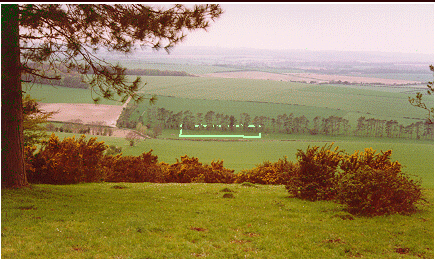 green) taken from the hillfort on Penbury Knoll. The Dorset cursus runs along the hills behind the site. |